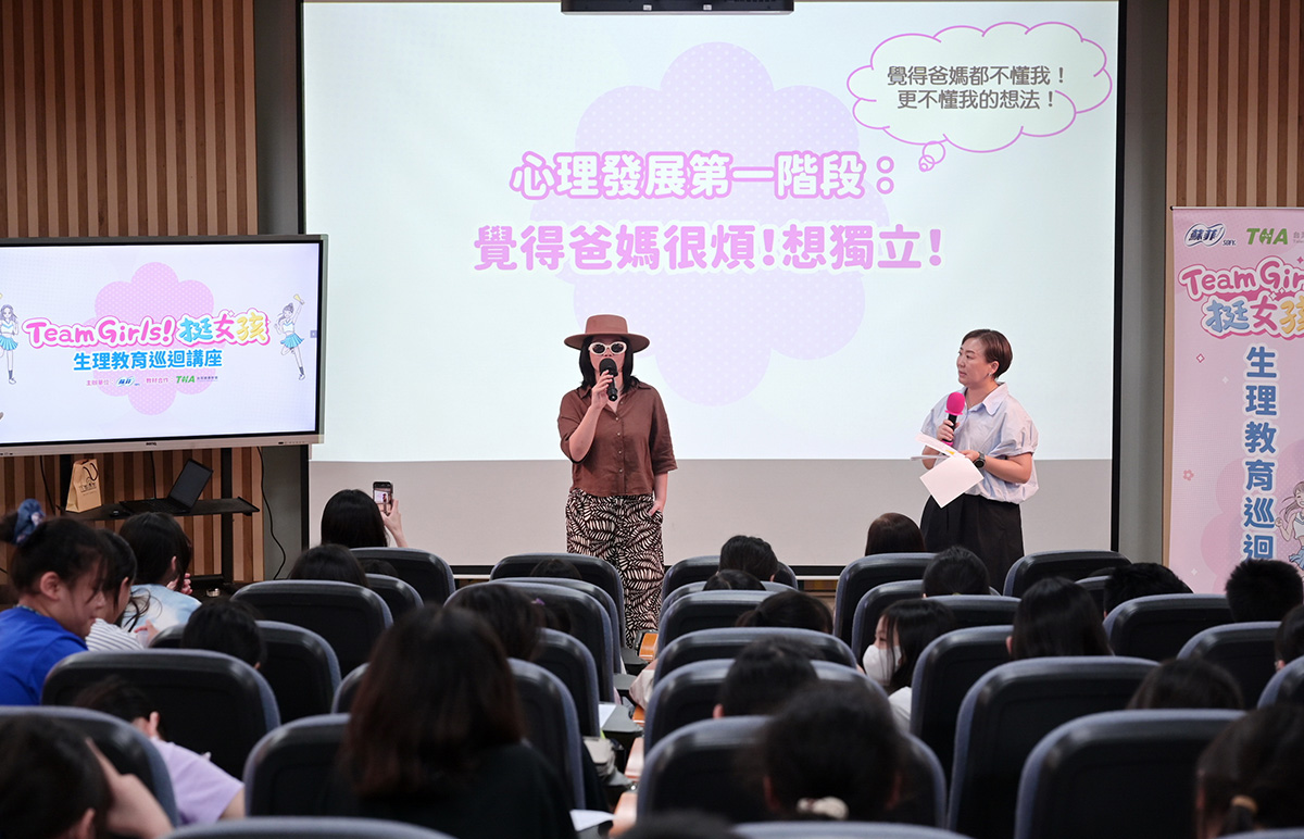 壞特?te不僅透過自身經驗分享學生時期如何面對月經,也強調月經不是不能討論的議題。她以創作之路為例,鼓勵大家勇敢表達想法,現場笑聲與掌聲不斷,同學們也踴躍提問,想與大學姐互動。張至婷醫師則以簡單易懂的方式,介紹男女生理構造、經前症候群與舒緩方法,並用小遊戲和問答帶動全場氣氛,場面溫馨熱鬧。